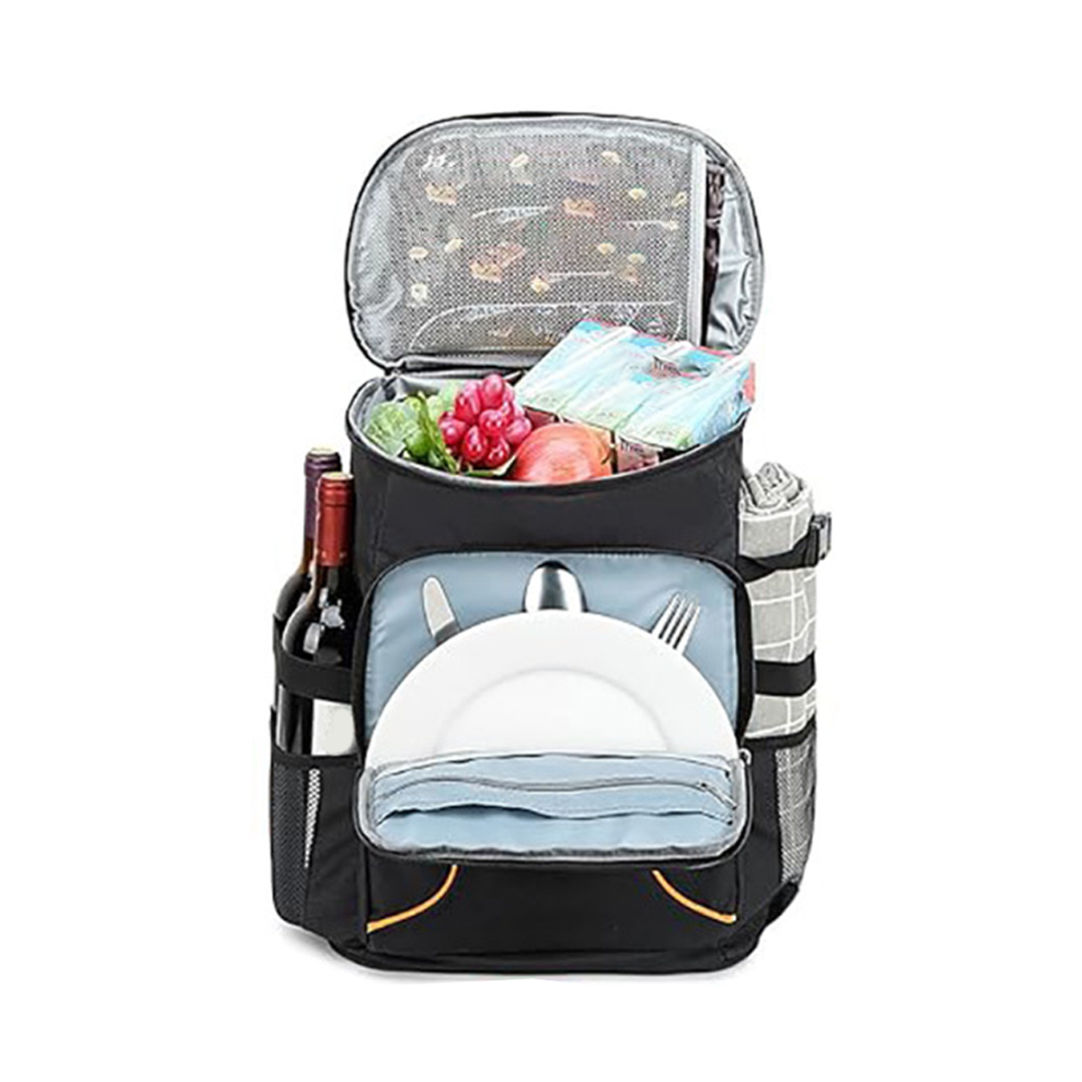This durable polyester cooler backpack has a 35L capacity, allowing you to carry a large amount of items. It provides excellent thermal insulation to keep your food fresh. The backpack features a snack bag on top, a food storage compartment in the middle, and a side pocket for a table cloth and wine. There is also a small compartment at the front for plates and forks. The firm and soft shoulder strap ensures easy and comfortable carrying. Perfect for camping, barbecuing, and outdoor outings.