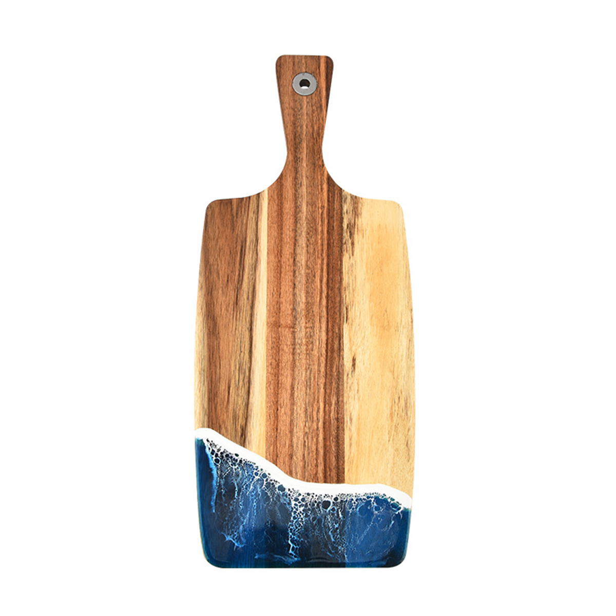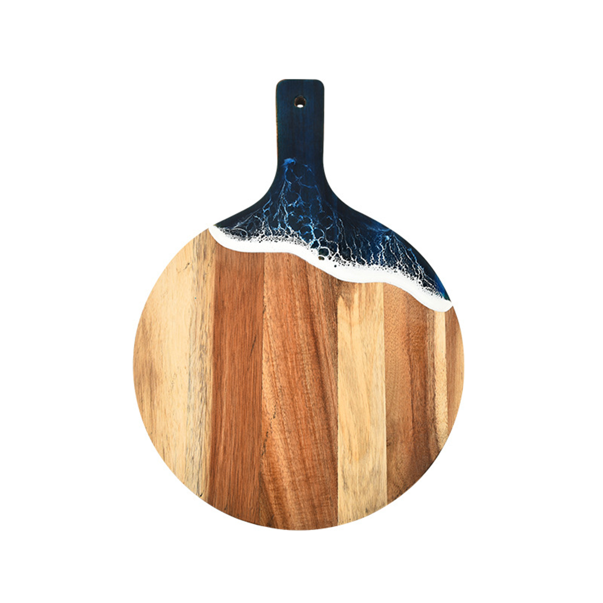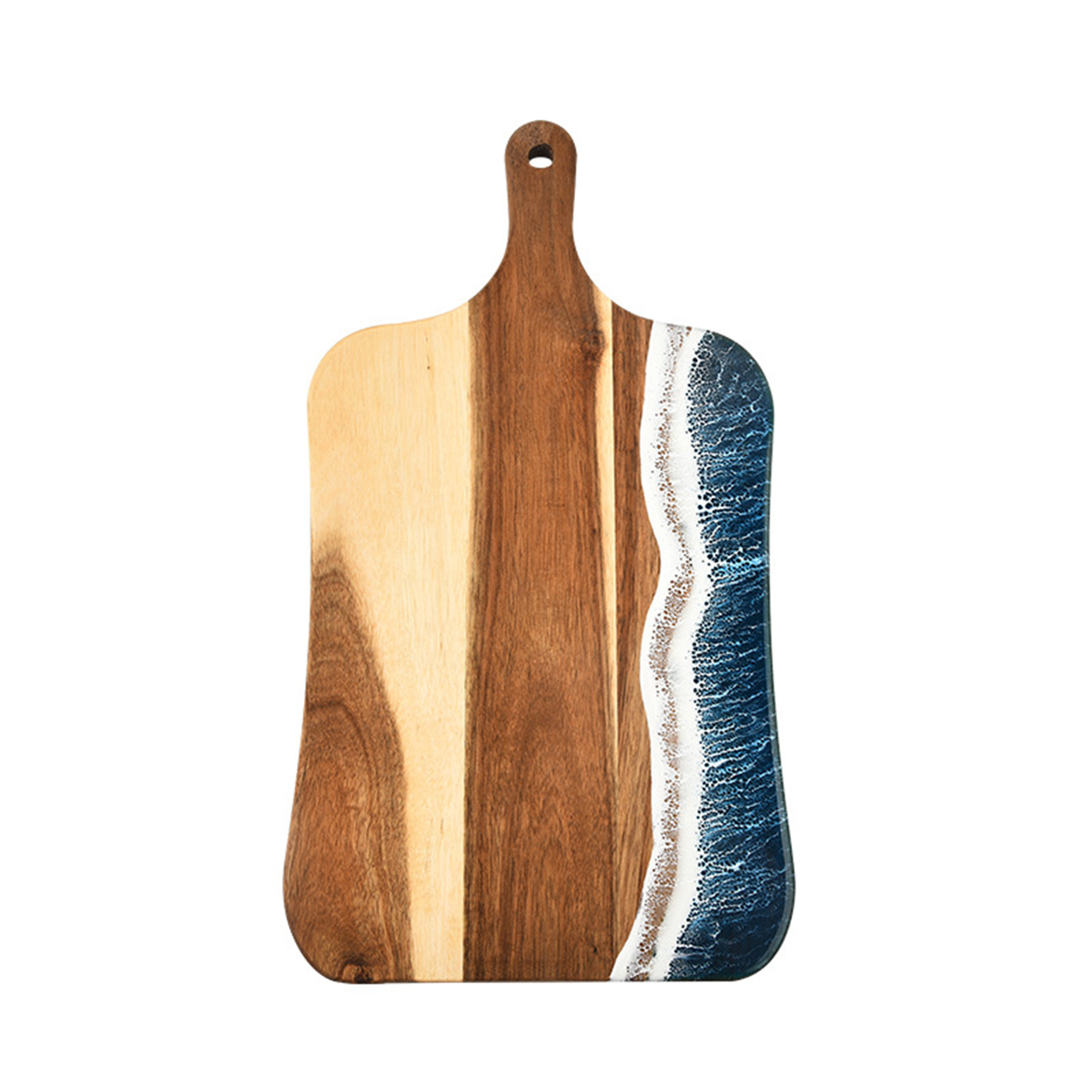 Expertly hewn from solid Acacia wood, prized for its exceptional stability and resilience. This cutting board is designed to withstand the rigors of everyday use without leaving unsightly scars, ensuring a durable and safe platform for your culinary endeavors. The food-safe resin preserves the captivating graphics for lasting beauty, withstanding daily use without chipping or fading.