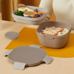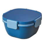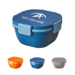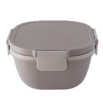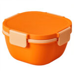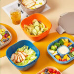 Four-compartment salad bowls with a separate sauce container to keep your salad, snacks, fruits, and other food items separate. Crafted from food-grade silicone and PP material for safety, reusability, and leak-proof storage. Ideal for work, office, school, and picnics.